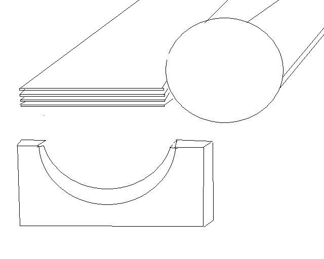 Du schneidest zwei oder drei solche Formen mit der Stichsäge aus, das obere Teil nimmst auch gleich her, dann setzut Du die Furnierlagen auf die Hohlform und streichst mit Kleber ein, dann die zweite und die Dritte und so weiter, als letztes kommt das Abfallstück von oben drauf ud alles wird zusammen verpresst, nächsten Morgen hast die fertige Wölbung |