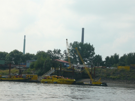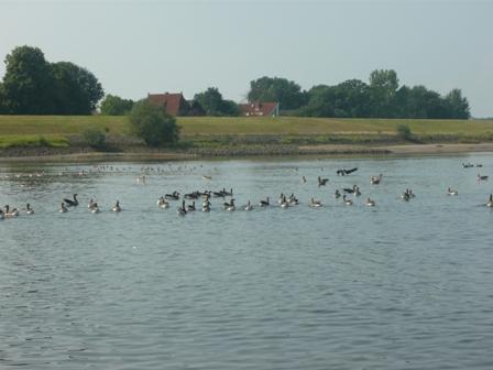 Gänse an der Niederelbe zwischen Lauenburg und Hamburg. Kampfmittelräumdienst NL Hamburg. Einfahrt von der Norderelbe in den Hamburger Hafen , City Sportboothafen Hamburg