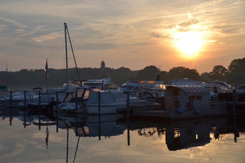 Wir haben kurz nach der Eisenbahnbrücke vor der Insel beim MSC angelegt. Mit dem Verein scheint es nicht zum besten zu stehen, denn der "Hafenmeister" oder "Platzwart" beklagte sich im Lauf des Gesprächs, dass heute nicht viel los sei und wenige seiner Clubkameraden sich aktiv an der Vereinsarbeit beteiligten. Im Internet finde ich den Club gar nicht. Wir durften für drei Stunden kostenlos liegen, wurden aber freundlich auf die Vereinskasse aufmerksam gemacht für die wir natürlich etwas daließen.Der Ort macht einen gut gepflegten Eindruck, hat zwei Kirchen, eine Windmühle, einige offenbar gute Restaurants und - sehr bekannt und beliebt - das Fischrestaurant Arielle. Dir haben einen großen Ponton, von wo aus man einen wunderbaren Blick auf die an der Insel vorbeifahrenden Wasserfahrzeuge aller Art genießen kann. Im Außenbereich ist Selbstbedienung mit Räucherfisch aus der eigenen Räucherei. Im Haus (mit großem Wintergarten) ist Restaurantbetrieb. Wir waren natürlich draußen und ließen uns den Fisch schmecken und waren davon zu abgelenkt, um zu fotografieren. In die Räucherei kann man einen Blick werfen; davor ist die zuvor abgebildete Installation aus Fischköpfen und -gerippen.Als wir da waren (14.9.), fand gerade eine Ruderregatta statt. |